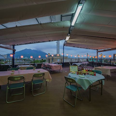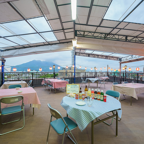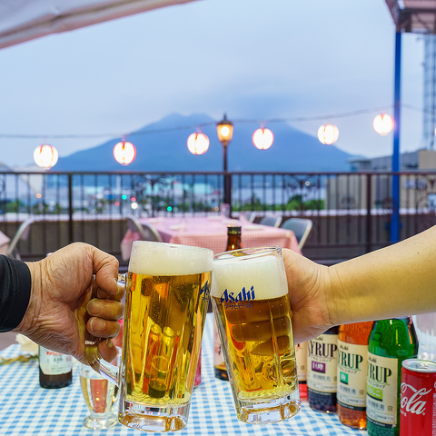 雄大な桜島を望むベイエリアの屋上テラス席!絶景を目の前に飲むビールは格別!