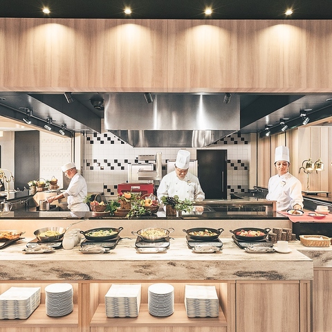出来たてを楽しむライブキッチン!シェフが目の前で仕上げるパフォーマンスとともにお楽しみください!
