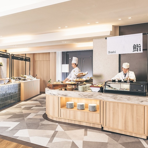 大きな窓から陽光が差し込む開放的な店内の中央には270°オープンキッチン!五感で楽しむビュッフェ★