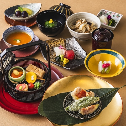 | テーブル | 4名様×1 | 【オープン席/4名様等】デートから少人数のお食事会までお気軽に。和情緒溢れるしっとりとした雰囲気の中、ゆったりとお食事をお楽しみいただけるオープン席。ご人数にあわせてお席はご用意いたします。ご家族水入らずでのお食事や、気心知れたご友人との楽しい会食に、ぜひお気軽にご利用ください。 |