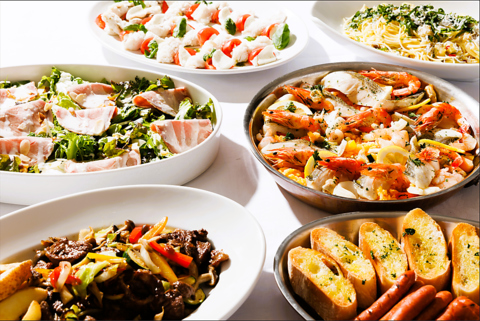 スモーク鴨のシーザーサラダ、炙りマグロのカルパッチョ、粗びきソーセージ、寒ブリの香草オーブン焼、国産牛サーロインのビステッカなど全6品をご提供するこちらのコースは2時間飲み放題。オプションでピッツァやデザート&コーヒーをお付けすることが可能☆※3日前までにご予約ください。