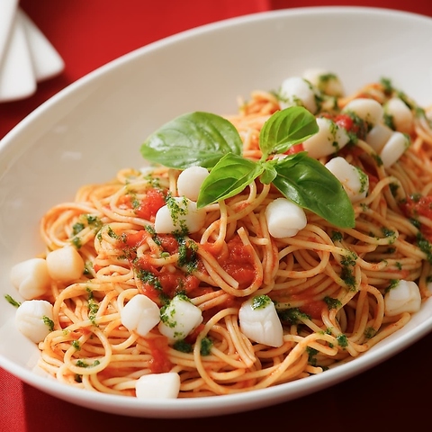 【コース料理例】色彩豊かな小柱とトマト、バジルのイタリアンカラースパゲッティで祭典を盛り上げよう