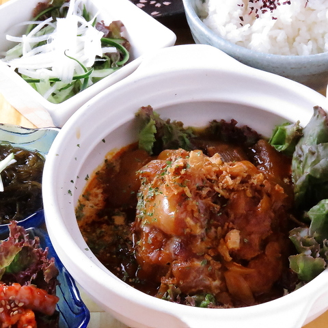 肉の旨みをぎゅっと閉じ込めたふっくらジューシーなハンバーグを、リンゴの甘味効かせた自家製デミグラスソースでじっくり煮込みました!時間をかけて煮込むことでソースがハンバーグにしっかりと染み込み、ひと口食べるごとに旨みが広がります。さらに小鉢やサラダもセットになっており、栄養バランスも満点◎