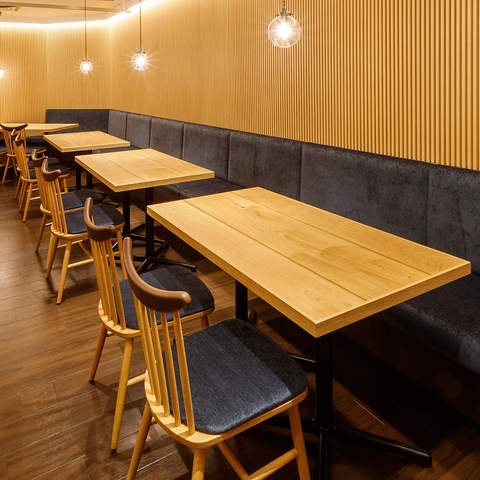 照明や天井の装飾からも和を感じられるスタイリッシュな店内。木のぬくもり空間で、ごゆっくりとお食事をお楽しみいただけます。