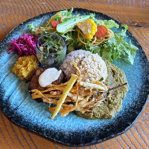 栄養価の高い種や皮などお野菜の旨味を余すことなく味わえるカレープレート。+100円(税込)でご飯大盛りにできます。