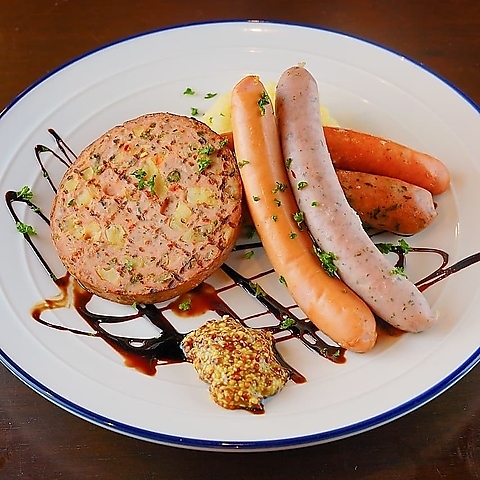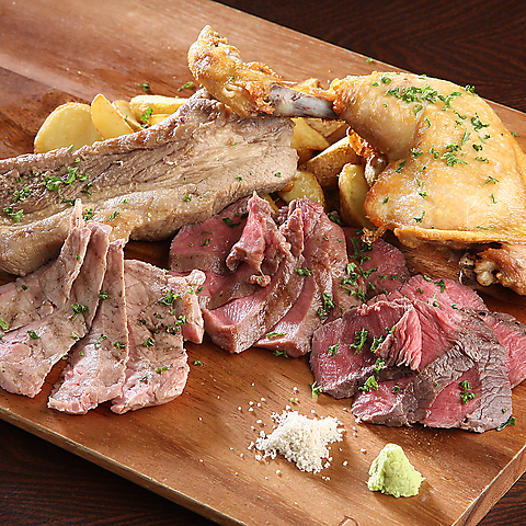 来たらまずコレ!1番人気!5種のお肉盛り合わせです!(若鶏のグリル、鴨肉のロースト、牛タンロースト、ぐんま麦豚のロゼ色ステーキ、赤城和牛のロースト)