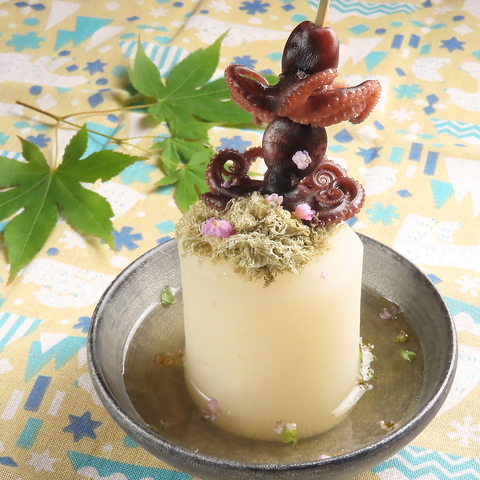 《タコちゃん大根》タコが可愛く乗った逸品で、SNS映え間違いなしっ!最高級『羅臼昆布』でとった美味しいお出汁が染み込んだ大根と一緒にどうぞ。