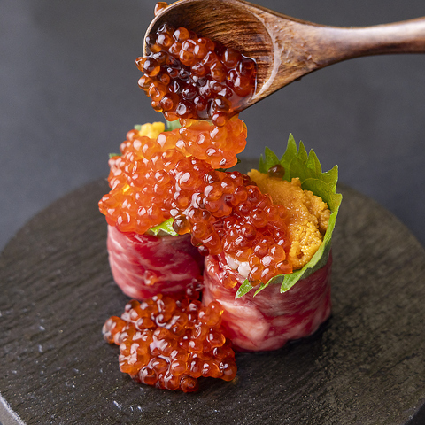 この冬、特別な忘新年会にぴったりの【忘新年会・宴会コース】をご用意しました!全9品のお料理には、濃厚なうにくとジューシーなにくら、さらには贅沢な牛ユッケ寿司とローストビーフが盛り込まれています。お肉好きにはたまらない内容で、心ゆくまでご堪能いただけます。さらに、プラス1650円で2時間の飲み放題もお楽しみいただけます。お寿司は握りでの提供となり、食べ応え抜群です!