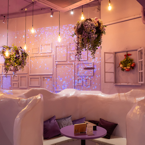 細部までこだわった紫基調のかわいい店内◎ 非日常を感じながらもほっこり落ち着く、癒しの空間をお楽しみください!