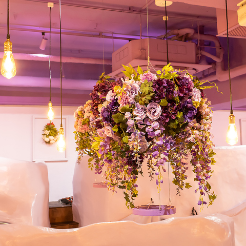 テーブル席上空の花束の下にスマホをセットすればお食事シーンを撮影することができます!