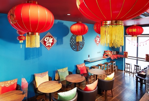 お席には、カラフルなクッションの数々。ターコイズブルーの壁に囲まれた上海レトロな雰囲気溢れるお洒落な空間が広がっています。