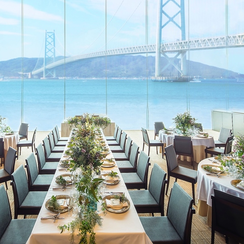 晴れた日には穏やかな柔らかい光が降り注ぎ、瀬戸内海と淡路島を望むロマンティックな景色を堪能できます。180°海に囲まれたパーティ会場もございます。