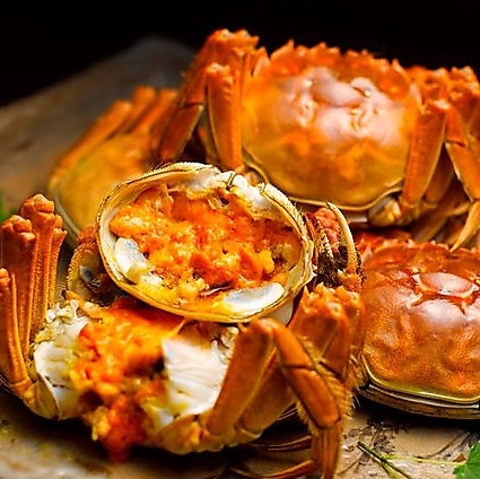 上海蟹のメスは、濃厚でクリーミーな卵が最大の魅力です。身はふっくらとして甘みがあり、繊細で上品な旨味が広がります。特に秋から冬にかけて旬を迎え、蒸し料理にすると香りとコクが一層引き立ちます。旨味あふれる卵とやわらかな身が楽しめます。※季節によってご案内出来ない時期も御座います。