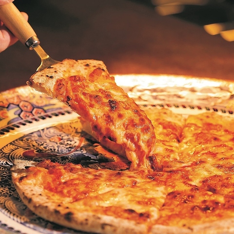 店内で専用のピザ釜で焼くピザです。ホテルオリジナルの4種のチーズを混ぜたプレミアムチーズとこだわりのトマトソースを使用しています。ディナーでは神奈川県産しらすが乗っています。