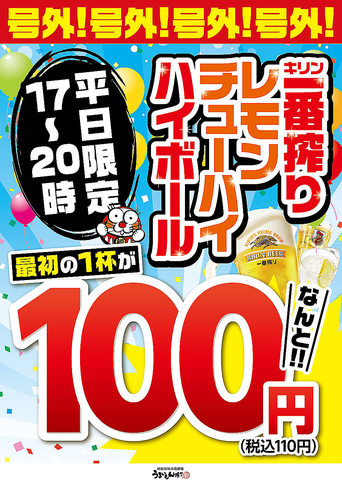 平日17~20時限定!生ビール、レモンチューハイ、ハイボールの最初の一杯をなんと110円(税込)でご提供!