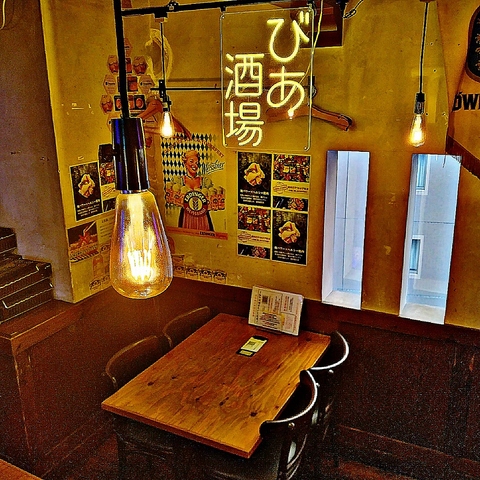 インダストリアル雰囲気のビアホール空間・少人数テーブル席