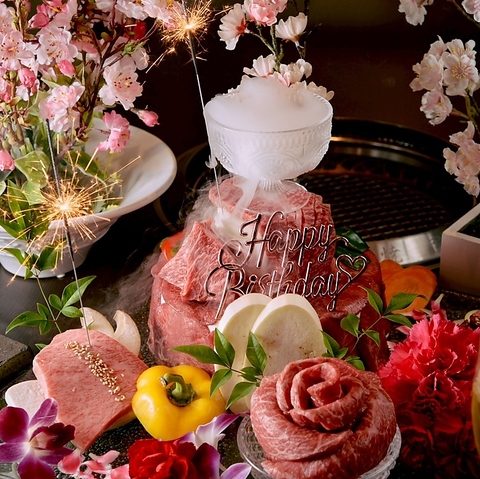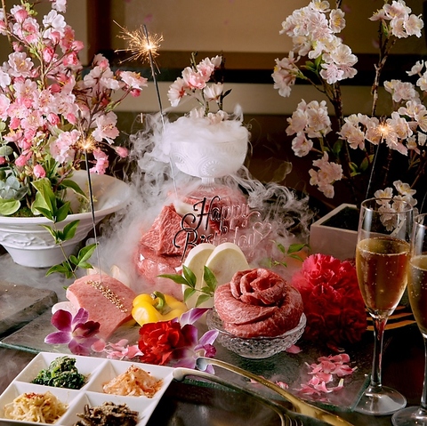 誕生日や記念日は記憶に残る特別なサプライズはいかがでしょうか?ドライアイスや夜桜をイメージした飾りつけで特別なサプライズを演出します。コースは9品8800円/11品11000円/13品14500円の3種類ご用意。全てのコースを華やかな盛り付けでご提供します。【栄/焼肉/居酒屋/飲み放題/個室/海鮮/誕生日/記念日/肉】