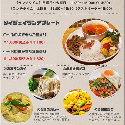 LINE@を友達登録していただくと、ソイジェイからメッセージが届きます♪週替わりランチメニューやお得なキャンペーン、店休日のなどの情報をお届け致します。ショップカードにも対応しております★ポイントが貯まった方には特典をプレゼント致します!お楽しみに!