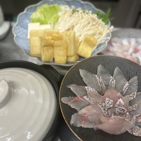 お鍋の食材は、温泉のお湯を飲んで育った美湯豚をはじめ、ブリ、タイ、和牛を扱っております。コース内容は全5品。(例)先付、揚げ物、お造り、蒸し物、鍋。