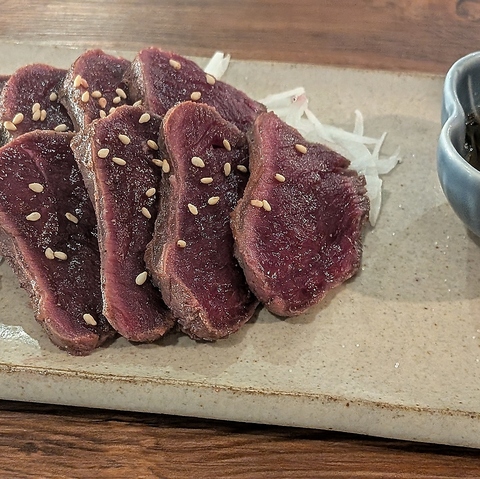 天然のエゾ鹿の新鮮なもも肉を表面をさっと強火で炙ってたたきにしました。自然豊かな北海道の山で育った鹿は、あっさりしながらもうまみが凝縮しており、臭みがなく柔らかい赤身肉です。ゴマ塩だれでダイレクトに味わってください。