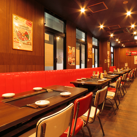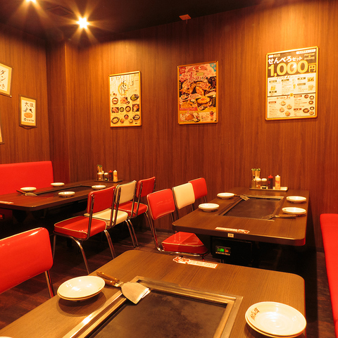 友達とワイワイ楽しめるテーブル席が充実!鉄板を囲んで、みんなで焼きながら盛り上がれるスタイルが人気です。