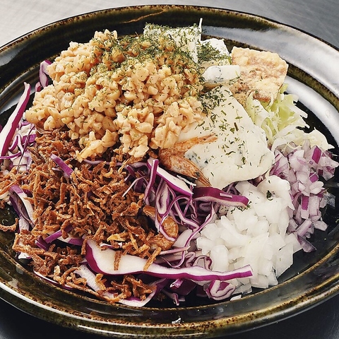 もんじゃのk時事に2種類の国産米粉を使用し、こだわりの具材と一緒にお米を入れ、米油でカリッと焼き上げる兎我野町発祥のもんじゃです。独自の焼き方で、具材の旨味を最大限に引き出しながら、お客様の目の前でスタッフが一枚一枚焼き上げます!