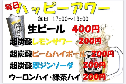 【お得に飲めるチャンス☆ハッピーアワー】毎日17:00~19:00はハッピーアワー!生ビール、超炭酸レモンサワー/ビームハイボール/翠ジンソーダ、ウーロンハイ/緑茶ハイがお得に飲める大チャンスです♪