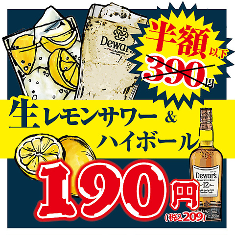 生レモンサワー&ハイボールが半額以下の190円(209円(税込))でお楽しみいただけます!料理と一緒にどうぞ◎