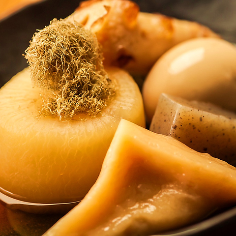当店の出汁は、最高級の「手火山式焙乾鰹節」を使用しております。手火山式とは、熱と煙をあてている鰹節を直接手に触れて鰹の温度を確かめる事から、そう呼ばれています。焙乾と熟成を繰り返すその手間から数少ない幻の製法となりました。"だし"に本気の当店だからこそ出せる深い味わいのおでんは必食の逸品です。