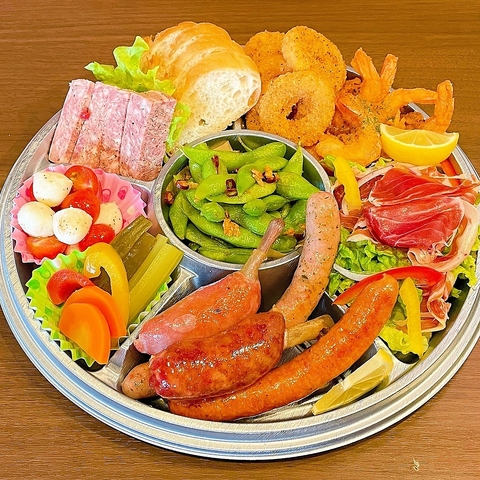 枠からはみ出した骨付きソーセージで盛り上がる!豪華イタリアン使用です。 ・骨付きソーセージ盛り合わせ・ハモンセラーノの生ハムサラダ・ガーリックシュリンプ・スパイシーチーズリング・パテ・ド・カンパーニュ・バケット・枝豆ペペロンチーノ・いろどりピクルス・ミニトマトモッツァレラ