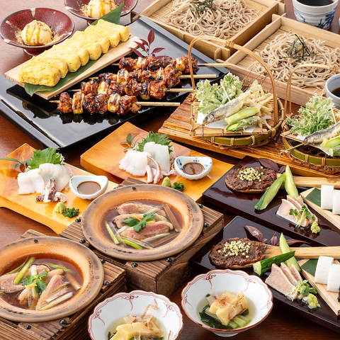 季節の旬の食材を使用した当店自慢の料理を様々堪能できる、至福のコースをご用意しております。新鮮なお刺身、名物のお蕎麦などどれも絶品で、お腹も心も大満足になります♪2時間飲み放題付き。お一人様+500円増で特選地酒三種も飲み放題にできます◎ご宴会など様々なシーンでご利用ください!
