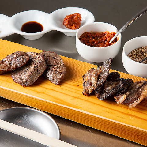鹿と猪の合挽のつくねは、ジビエ独特の食感と青唐辛子の刺激でお酒がススむ人気の一品。+蝦夷鹿、日本鹿、天然猪、雉を各2貫ずつ、今日のいいところを大将が絶妙な焼き加減で焼き上げてご用意します!初めての方や少しずつ色々な肉を楽しみたい方におすすめです。