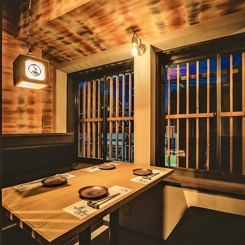 2名様~ご利用可能な窓際の換気が可能な個室のご案内です。接待・お食事会にぴったりの落ち着いた雰囲気の和空間で、ゆったりとお寛ぎ頂けます。ご人数に合わせてお席をご用意!《焼き鳥・肉・海鮮・もつ鍋・牡蠣》