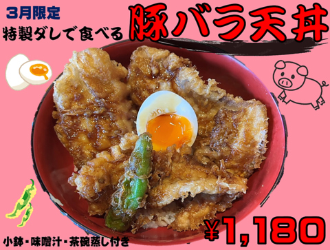 3月の限定丼は豚バラ天丼!!手作りの特製天丼ダレがかかっている豚バラ天丼をお楽しみください☆
