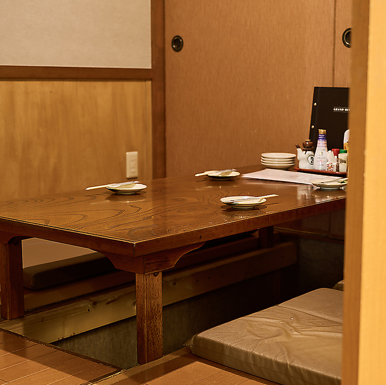 4名から6名様まで利用可能な掘りごたつの個室がございます。また、お隣の掘りごたつのお席も12名様の場合は個室として利用可能です。座り心地の良い座布団もご用意しておりますのでリラックスしてお食事をお楽しみいただくことができます。個室としての利用は人気なのでご予約はお早めに。