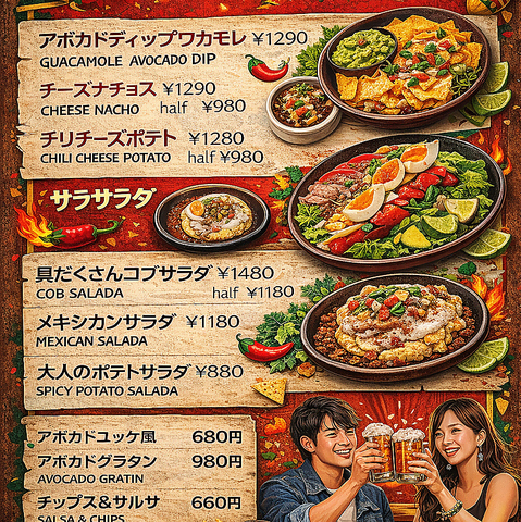 TexーMexを中心に、飲みながら軽くつまめる料理までお客様の幅広いニーズに応えます!よろしくお願いします辛さ控えめになっておりますので 安心してお召し上がりいただけます激辛がお好みでしたら テーブルにご用意しております 自家製サルサでカスタマイズ!