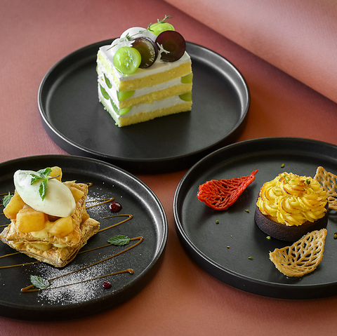 パティシエが腕を振るってひとつひとつ丁寧に作り上げた絶品スイーツ。+600円(税込)でドリンクを1杯お選びいただけます。