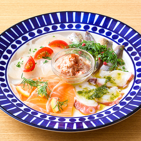 新鮮な魚介を使用した【ISOMARUの海鮮カルパッチョ】見た目も華やかに、食べる前からわくわくが止まらない逸品です!海鮮も野菜もお肉も新鮮なものが揃っておりますのでぜひいろいろお楽しみください♪