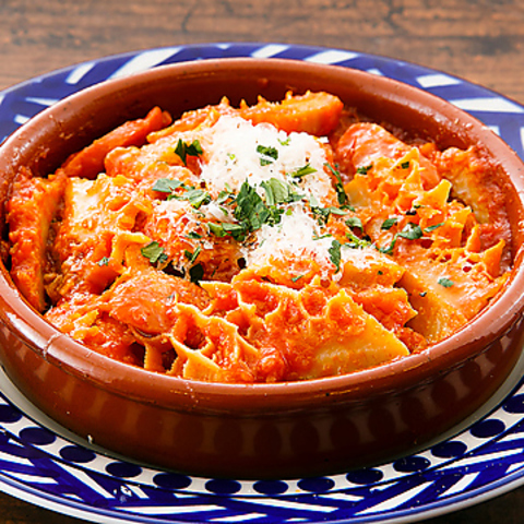 つぶ貝と茄子のアラビアータは、程よい辛味と旨味が融合した一品◎つぶ貝の食感と柔らかな口当たりの茄子が、トマトの酸味と絶妙に絡み合い、食べるたびに幸せな気分に★目にも楽しい色鮮やかな盛り付けに思わず食欲がそそられる逸品、是非一度お試しください♪