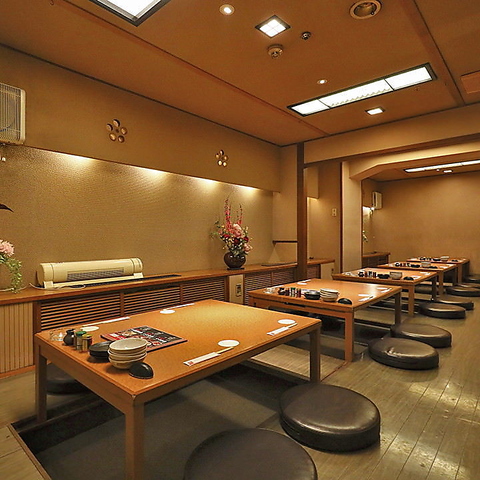足を下ろしてゆっくりと座れる掘りごたつのお部屋を、10名様用、12名様用とご用意しています。ふすまを取り外して中人数のお部屋にもすることができるほか、オープン席とつなげて最大42名様のスペースとしてもご利用いただけます。大人数の企業宴会や打ち上げにもおすすめです。ぜひお気軽にご相談ください!