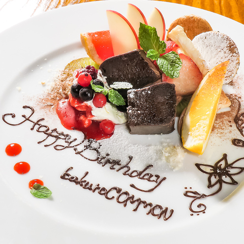 【記念日や誕生日に】大切な方のお祝いも承っております☆ 当店自慢のスイーツやフレッシュなフルーツをメッセージと共にデザートプレートでご提供◎(1500円~、前日まで要予約) ご友人同士やデートにももちろん、パーティーや女子会にもオススメです♪ 素敵なサプライズで記憶に残る1日のお手伝いをさせていただきます☆