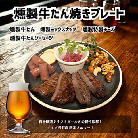 当店限定の燻製牛たんプレートは当社で醸造しオリジナルクラフトビールと相性抜群です。