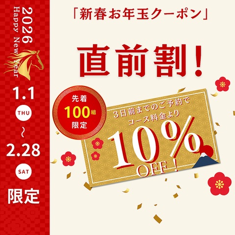 【直前割】ご利用日3日以内のご予約でコース料金10%オフ!クーポンメニューからご利用ください※1・2月限定