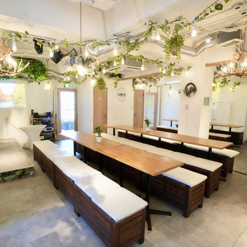 準備や片付け、天気の心配、当日の買い出し…などなど意外と面倒なことが多いBBQ。それでもやりたい!渋谷駅徒歩2分で叶う本格的なバーベキューグリルでの天候心配無用のBBQ!木材や木目、緑を活かしたガーデンをテーマにした内装で温かい雰囲気。真新しいお店で気軽に飲み会を☆カラオケもできるエンターテインメントなガーデン空間
