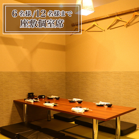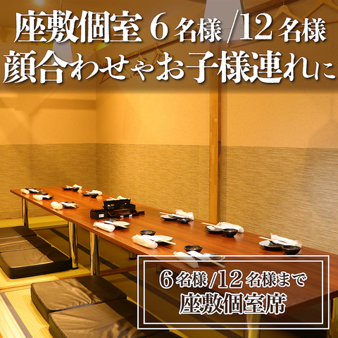 【ふかふか座布団の座敷席~12名まで】座敷・掘りごたつ・テーブルの個室をご用意!ゆっくりくつろげる広めの個室もございます。座敷席はお子様連れも安心でファミリーにもおすすめです。周りを気にせず宴会、飲み会など様々なシーンでお楽しみ頂けます。※お子様を連れてのご利用の場合は予約時にお伝えください