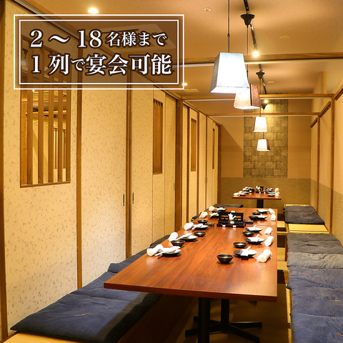 【畳エリア18名様テーブル個室】1列で宴会できる角のお席です!人数に合わせてご案内可能なテーブル個室。お部屋の壁を取り外せば、10名様以上でのご利用も可能ですので、ご希望の方はお気軽にお問い合わせください。