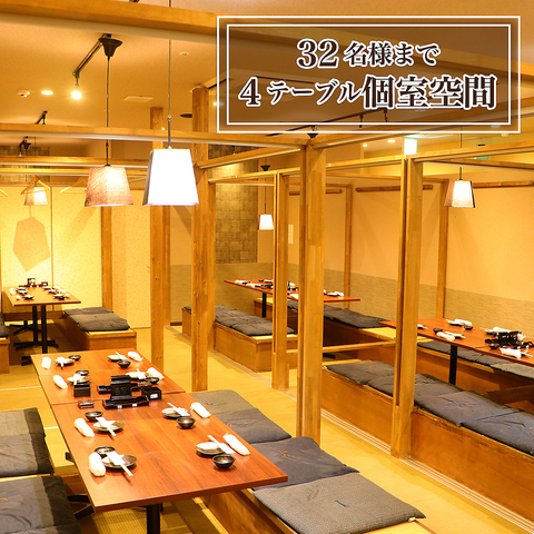 【32名様まではNET予約可能!最大86名様迄の個室】2~10/18/22/32/55~86名様まで可能な畳エリアのテーブル個室の空間は、会社で集まるご宴会や、主役を祝う送別会や各種宴会におすすめの空間です。他のお客様を気にすることなくご宴会を満喫いただけます!。頂けます◎大人数希望はお電話にてお気軽にお問い合わせ下さい!