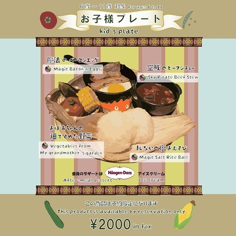1.おばあちゃんの畑でとれた野菜2.魔法のベーコンエッグ3・空賊のビーフシチュー4.まじないの塩おむすび5.食後のデザート:アイスクリーム(ハーゲンダッツ)※6歳~11歳対象です※予約限定です。
