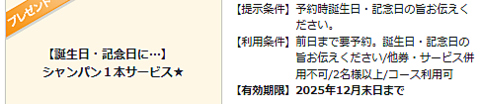 【提示条件】予約時誕生日・記念日の旨お伝えください。【利用条件】前日まで要予約。誕生日・記念日の旨お伝えください/他券・サービス併用不可/2名様以上/コース利用可【有効期限】2025年12月末日まで