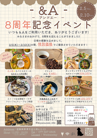 いつも&Aをご利用いただきありがとうございます。皆様のおかげで8周年をむかえることができました。日頃の感謝を込めまして、2/5(木)-2/10(火)の期間、MAX25%OFFの特別価格にて提供させていただきます。イベント期間中はお電話またはリクエスト予約のみのご予約となります。